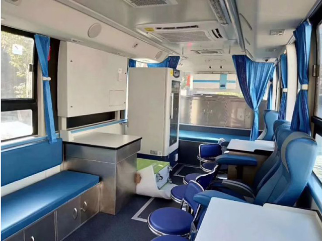 配置鋰電池系統(tǒng)的9米長的采血車,取消了傳統(tǒng)發(fā)動機的供電用鋰電池完全代替??梢詽M足一天8小時的采血工作需求,鋰電池放置在下面的行李艙里面。后面這個就是整個的一個電池塊。大概有60度的電。內(nèi)飾進行了升級,包括它的風(fēng)道,頂棚,包層柱都做了一個商務(wù)改造。車廂的布局符合獻血流程。采血區(qū)域一共有四個采血位,可以四個人同時采血。旁邊是登記跟初篩的工作臺。負(fù)責(zé)給采血的人進行登記。檢測血型,做簡單的初篩。