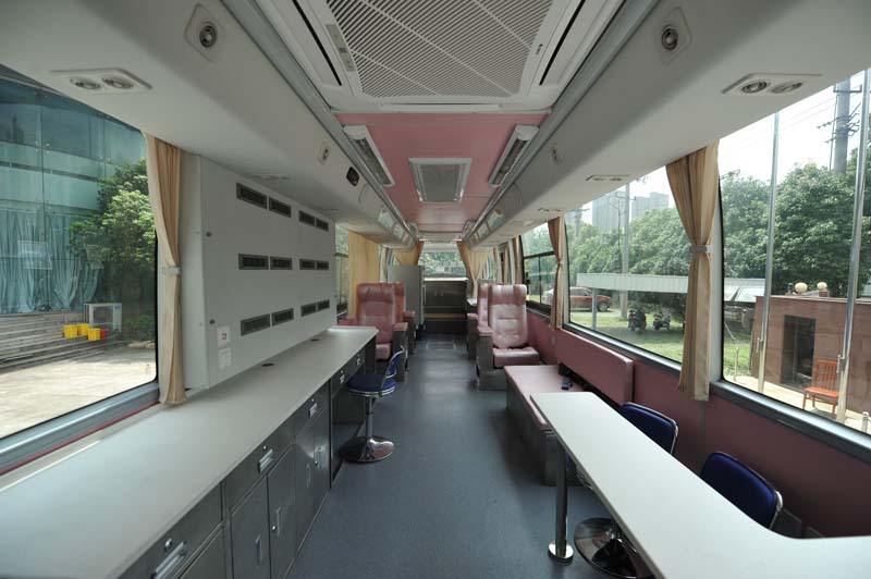 專(zhuān)業(yè)的流動(dòng)獻(xiàn)血車(chē)征詢(xún)區(qū)、體檢區(qū)、采血區(qū)、休息區(qū)布置合理,綠色、環(huán)保的特點(diǎn),實(shí)現(xiàn)廢氣零排放。車(chē)內(nèi)配置了頭等艙式獻(xiàn)血椅,獻(xiàn)血車(chē)實(shí)際所用到醫(yī)療設(shè)備一應(yīng)俱全,總體空間十分寬闊。大部分流動(dòng)的獻(xiàn)血車(chē)都有冷暖空調(diào)系統(tǒng)、熱合機(jī)臺(tái)、醫(yī)用血液冷藏箱、工作臺(tái)椅、飲水機(jī)、烘手機(jī)、配電柜、采血椅、采血臺(tái)、紫外線(xiàn)消毒燈、 污物桶、滅火器、排風(fēng)系統(tǒng)等。全車(chē)配備先進(jìn)的平穩(wěn)支撐系統(tǒng),配置了網(wǎng)絡(luò)WIFI,空氣凈化消毒系統(tǒng),確保獻(xiàn)血活動(dòng)開(kāi)展時(shí)車(chē)內(nèi)空氣的潔凈衛(wèi)生,是一個(gè)移動(dòng)體檢中心可用于現(xiàn)場(chǎng)體檢和采血。