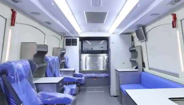 配置鋰電池系統(tǒng)的9米長的采血車,取消了傳統(tǒng)發(fā)動機的供電用鋰電池完全代替??梢詽M足一天8小時的采血工作需求,鋰電池放置在下面的行李艙里面。后面這個就是整個的一個電池塊。大概有60度的電。內(nèi)飾進行了升級,包括它的風(fēng)道,頂棚,包層柱都做了一個商務(wù)改造。車廂的布局符合獻血流程。采血區(qū)域一共有四個采血位,可以四個人同時采血。旁邊是登記跟初篩的工作臺。負(fù)責(zé)給采血的人進行登記。檢測血型,做簡單的初篩。