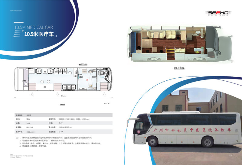 顯浩專用車生產(chǎn)的體檢車均選用一線品牌車(宇通、金龍、金旅)實(shí)用、先進(jìn)、布局合理、操作方便、駕乘舒適。 體檢車長(zhǎng)有6米、7米、8.2米、9米、10.5米、11米、12米可選。